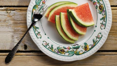 הסדרה בהשראה אוריינטלית עם עיטורים פרחים ירוקים בשולי הכלי.